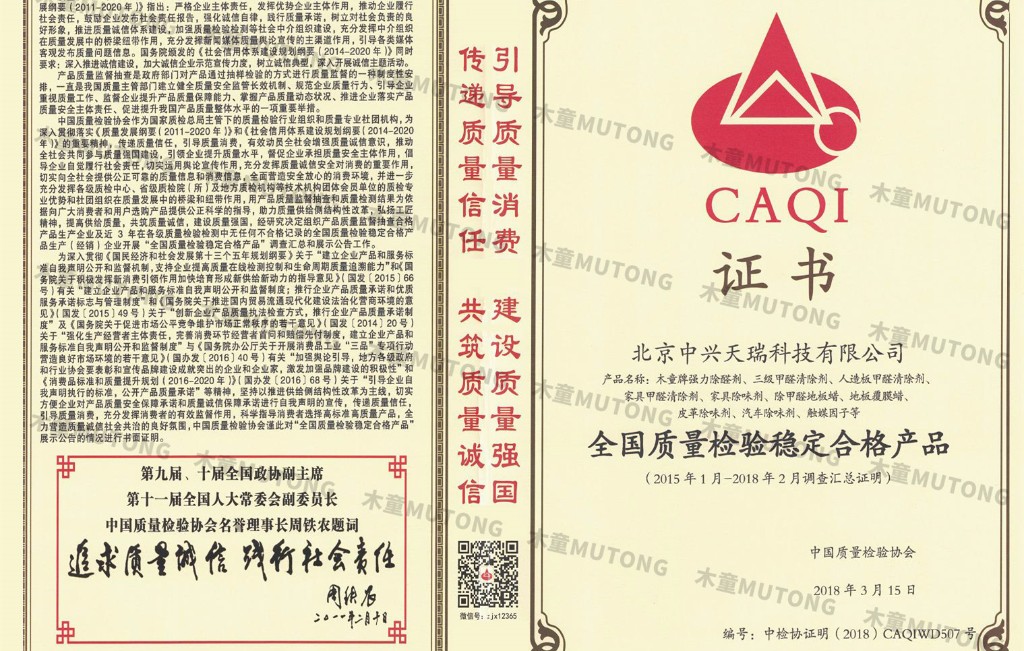 2018年木童除甲醛除異味系列室內空氣污染治理產品憑借其核心技術優勢和過硬的產品質量以及空氣治理明顯效果,再次榮獲“全國質量信得過產品”榮譽稱號。